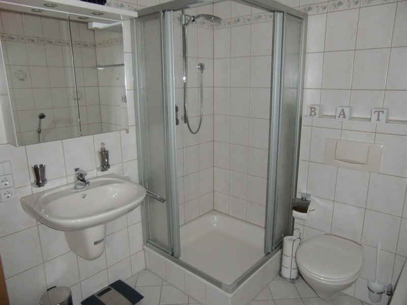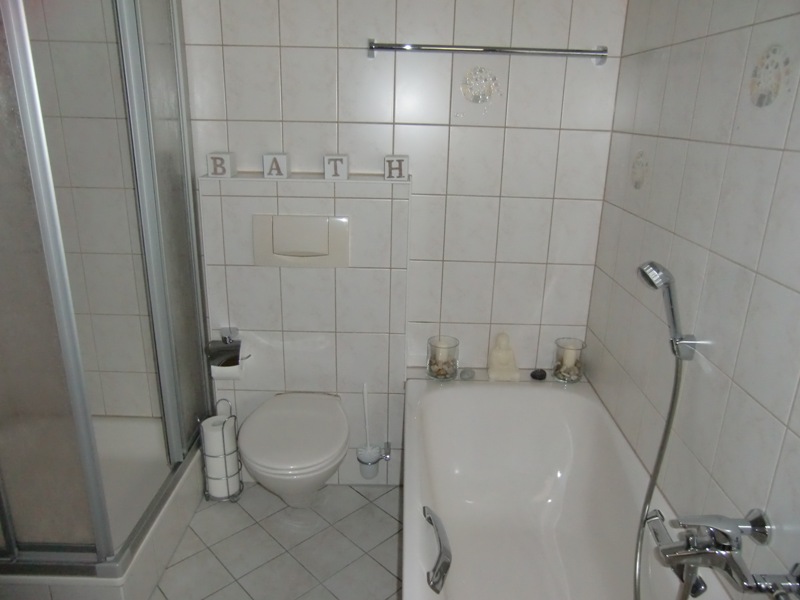 Mit Badewanne, separate Dusche, WC, Waschbecken mit beleuchtetem Spiegelschrank, Föhn und Bademäntel, Handtücher sind vorhanden.